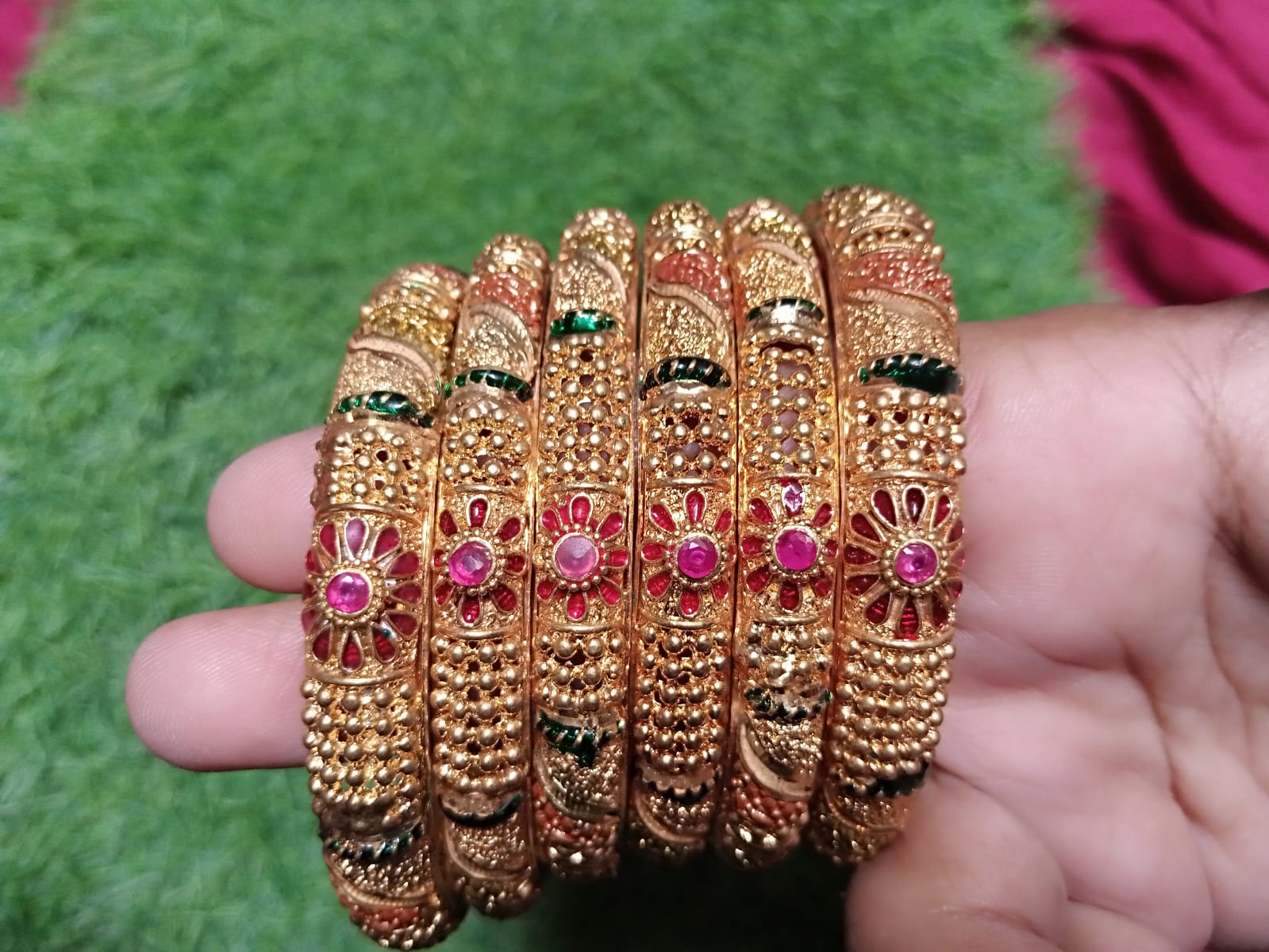 Stone Detailing: Vibrant pink, red, and green stones in intricate floral patterns