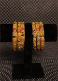 Indulge in the grandeur of Indian craftsmanship with our Royal Rajwadi Bangle Set. These stunning bangles are a perfect blend of tradition and elegance, featuring intricate gold-plated designs that embody timeless beauty. Each bangle is adorned with meticulously set stones in pink, red, and green hues, arranged in an exquisite floral pattern that radiates charm and sophistication.
