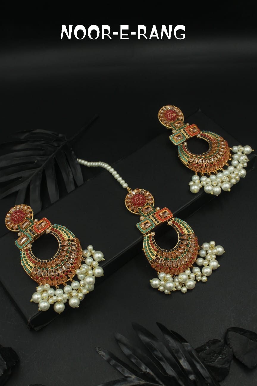 Bring timeless elegance to your ethnic look with this stunning Noratan Jewelry Set. Designed with intricate detailing, the set features bold red and green stonework highlighted with delicate Kundan accents and finished with clusters of pearls for a graceful touch. Perfect for weddings, mehndi, mayun, or festive occasions, this set adds royal charm to your traditional outfits.